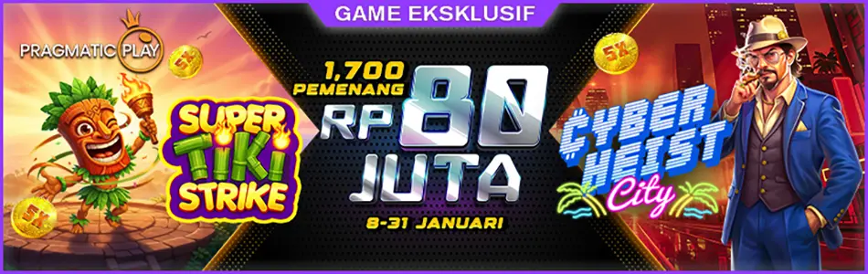 Cash drop Game Eksklusif oleh Pragmatic Play untuk Cyberheist City dan Super Tiki Strike akan berlangsung mulai 8 Januari 2026 hingga 31 Januari 2026 setiap hari dari pukul 00:00 WIB - 23:59 WIB. Total hadiah cash drop sebesar Rp 80,000,000 akan dibagikan kepada 1.700 pemain beruntung.